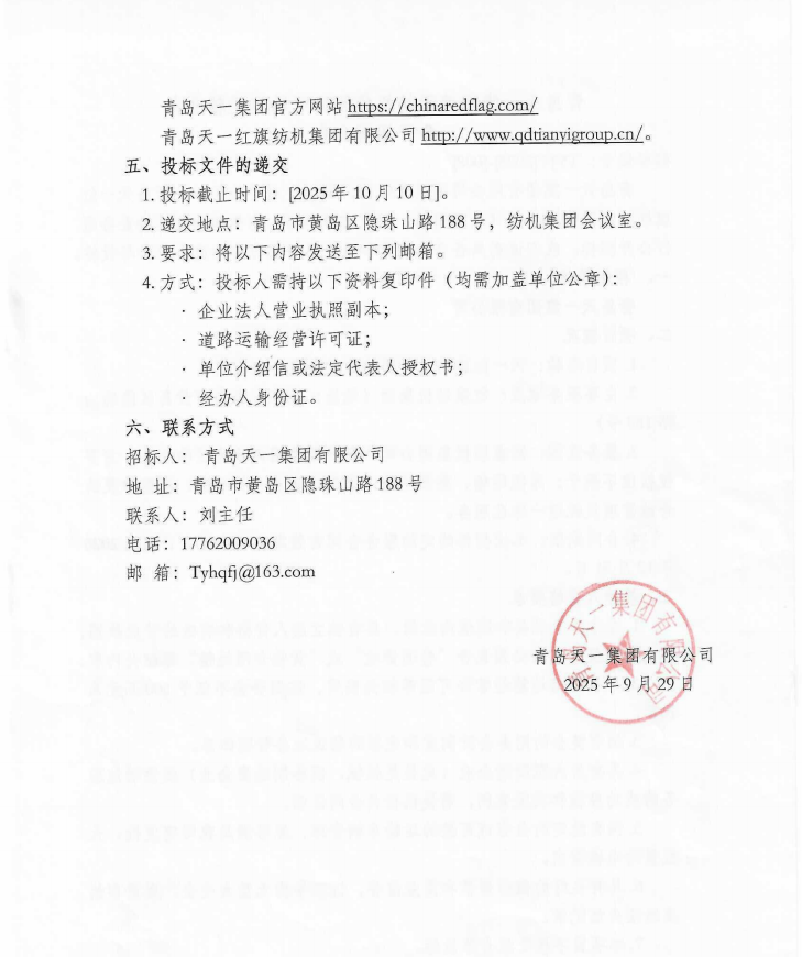 青島天一集團關(guān)于紡機集團公司物流運輸業(yè)務(wù)公開招標公告
